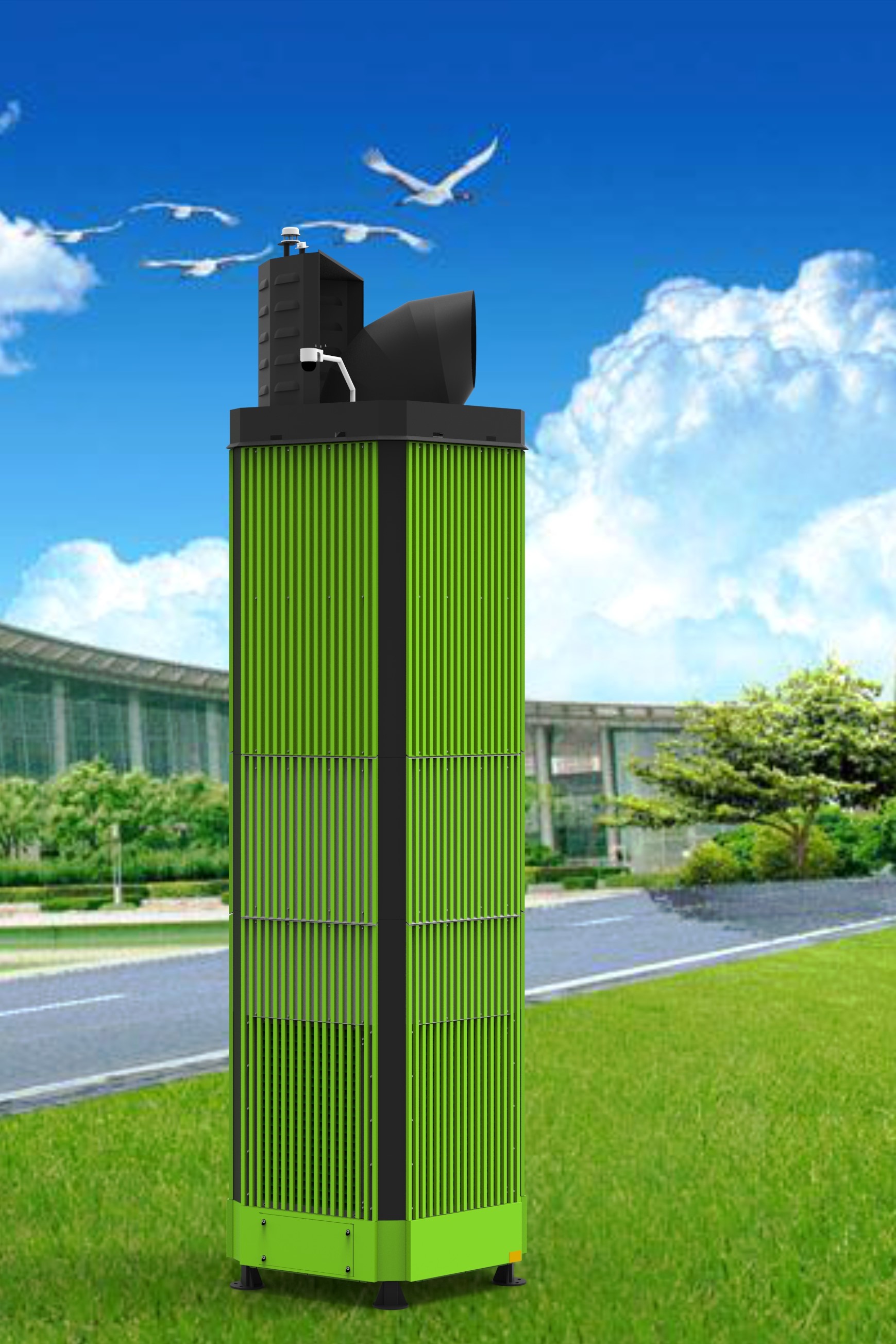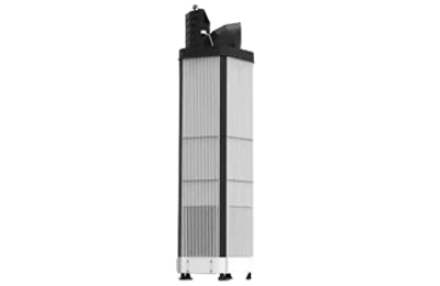 装备采用柱式设计,下部四周为进风区域,将四周的污染空气吸入设备;应用高分子板式高压电场,碳基材料工程化技术:碳基材料+阻燃工程塑料. 并结合ACF气体污染物治理技术的有效处理,将净化后的空气于设备上方的出口输送到大气中,完成周边小区域的空气治理。